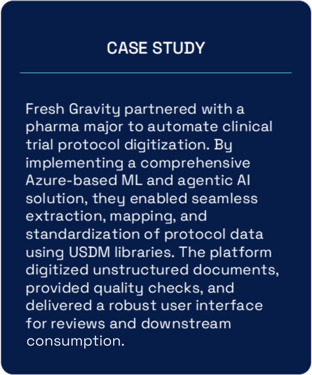 The most transformative opportunity lies in adopting the CDISC Unified Study Definitions Model (USDM) to digitize clinical protocols. This enables automated generation of downstream documents such as CSRs and CRFs, directly from structured protocol data. It also supports reuse of protocol components across studies, accelerating authoring, and reducing errors. Fresh Gravity’s lifio.ai platform offers the technology and expertise to implement USDM-driven processes.